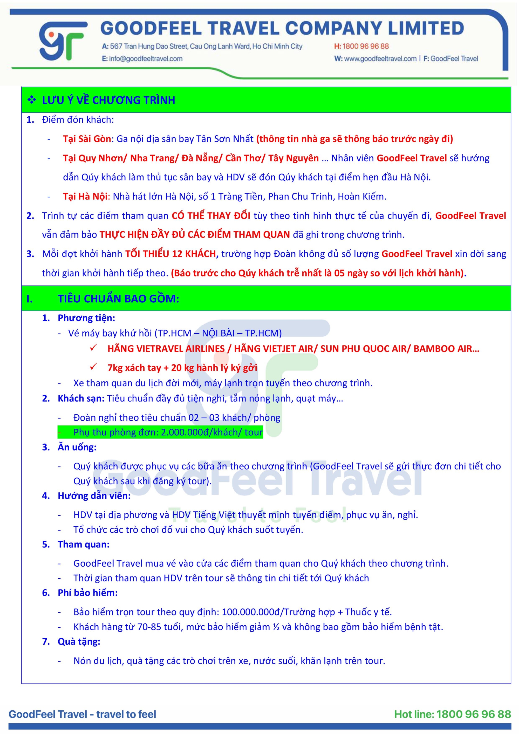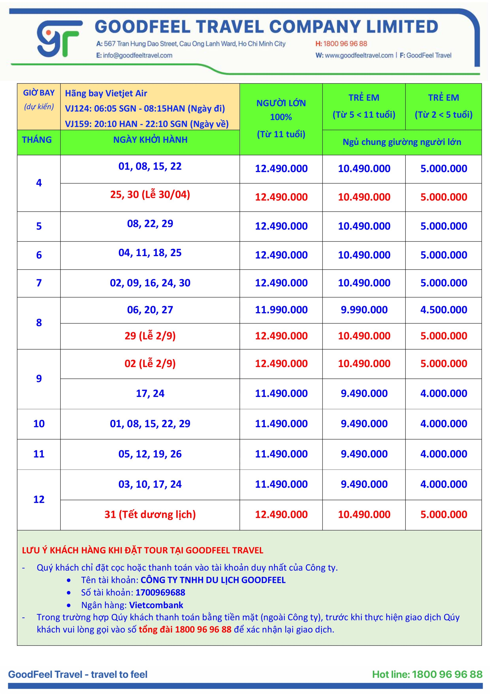 | NGÀY KHỞI HÀNH | SỐ NGÀY | HÃNG BAY | SỐ CHỖ | NGƯỜI LỚN ( Từ 11 tuổi ) |