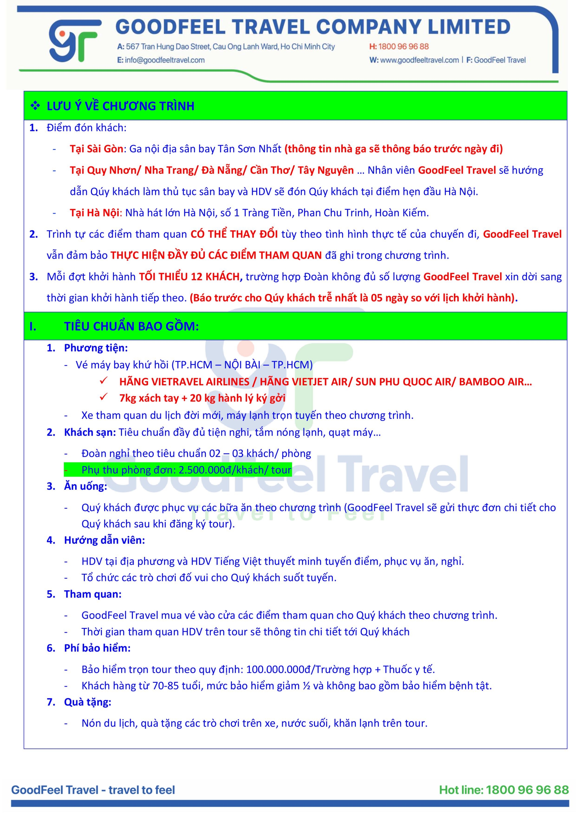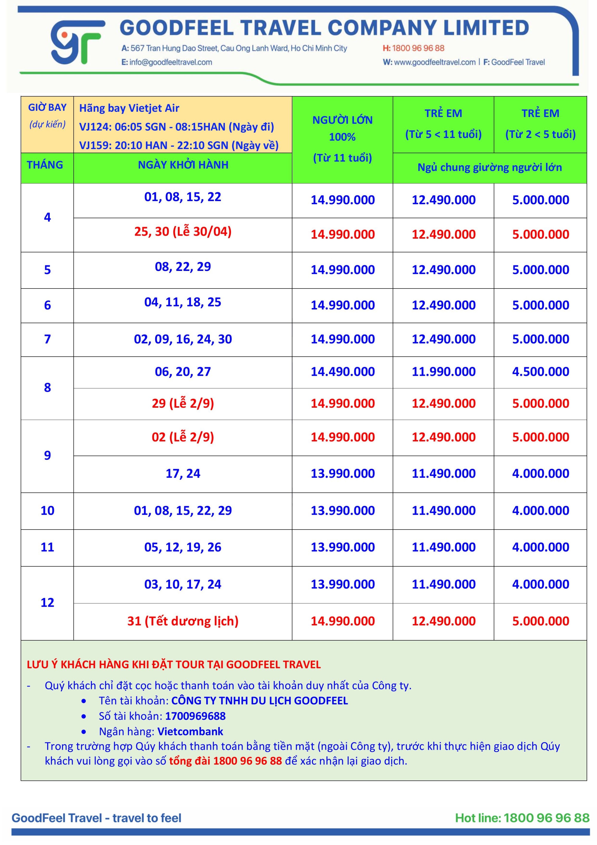 | NGÀY KHỞI HÀNH | SỐ NGÀY | HÃNG BAY | SỐ CHỖ | NGƯỜI LỚN ( Từ 11 tuổi ) |